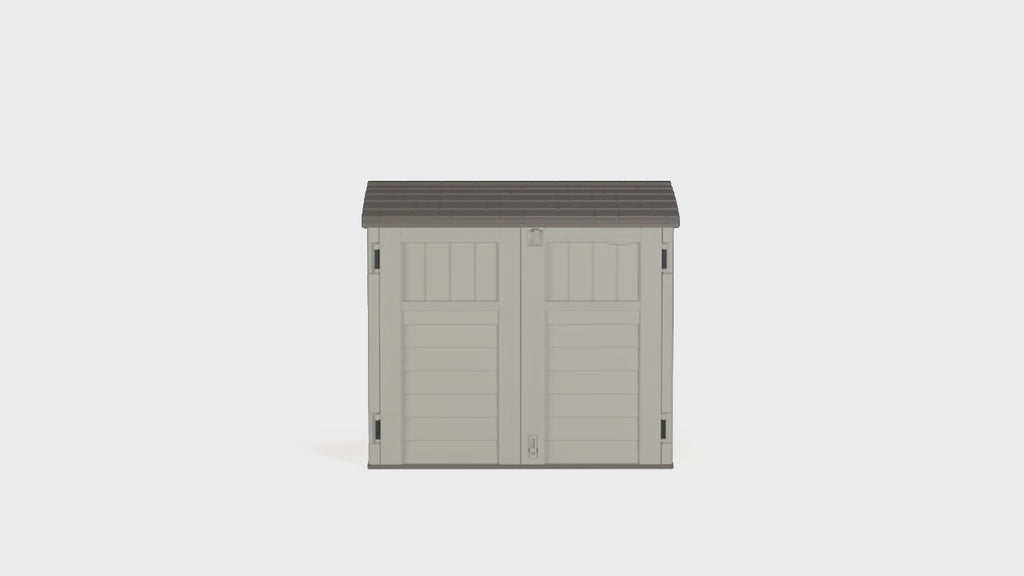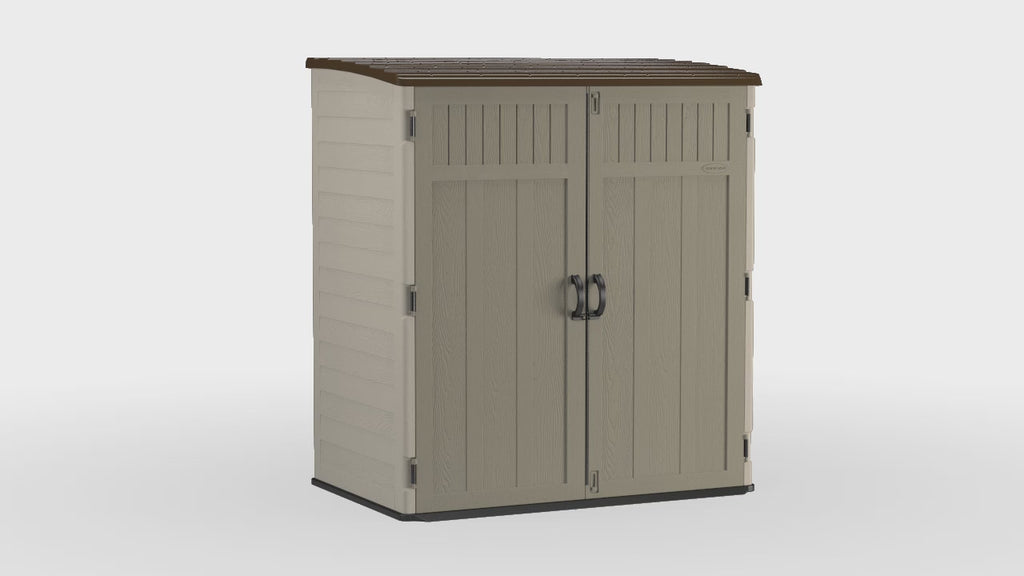 This extra-large vertical shed is perfect for storing a variety of lawn and garden equipment. The slim footprint design fits nicely along a house or garage for when yard space is limited. Double-door entry allows you to access up to 106 cu. Ft. Of storage space and is equipped with pad-lockable handles for added security (lock not included) Constructed of multi-wall resin panels, this durable shed can hold up to the elements and protect your items all year long.