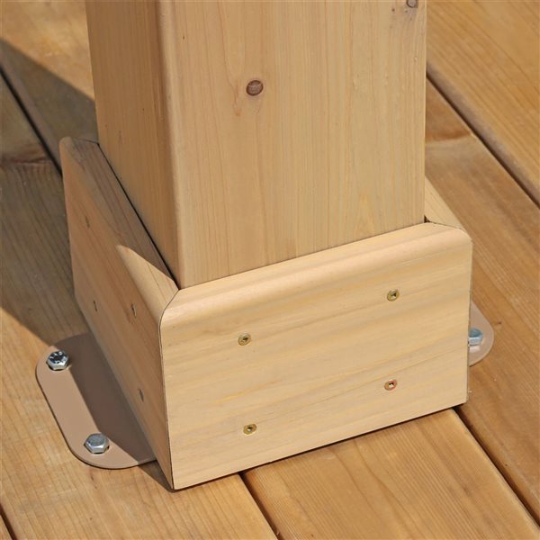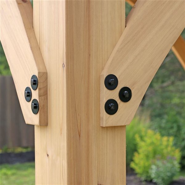 Enhance your outdoor living area with Yardistry's 10 x 10-ft Meridian Gazebo. This wooden gazebo, featuring an aluminum roof, adds charm to any setting, making it ideal for all your outdoor gatherings. Its elegant design showcases a coffee-brown coloured aluminum roof, sturdy 5.5 x 5.5-in posts, and robust curved corner gussets. Crafted from 100% cedar lumber, it boasts a beautiful natural cedar stain finish that adds warmth and character to any space. Follow the illustrated step-by-step instructions for easy installation. The versatile Meridian Gazebo with aluminum roof by Yardistry is perfect for transforming any outdoor area into a functional and inviting space.
