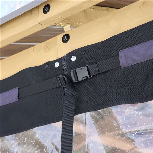 Constructed from 0.45-mm thick, clear PVC, rigorously tested for cold resistance, the cover features UV-resistant black oxford fabric with a water-resistant bottom hem, ensuring longevity and protection against sun damage and rain. Marine-grade snaps facilitate effortless installation and removal, while nylon buckles allow for an adjustable, snug fit. Premium webbing between the PVC and oxford fabric enhances tear resistance, ensuring the cover withstands outdoor rigors. Heavy-duty outdoor zippers with full-length panels completely enclose the gazebo, providing comprehensive coverage and security. Compatible with most Yardistry accessories, this winter cover not only shields your gazebo but transforms it into a reliable storage space for your outdoor furniture and decor.